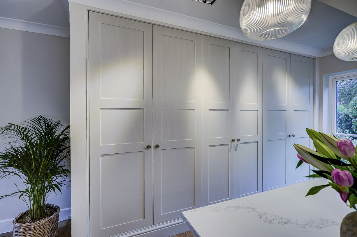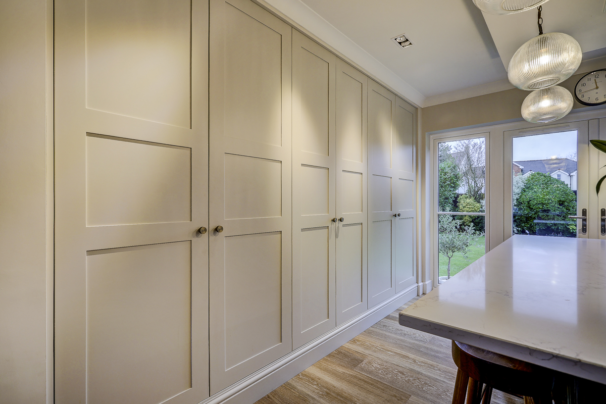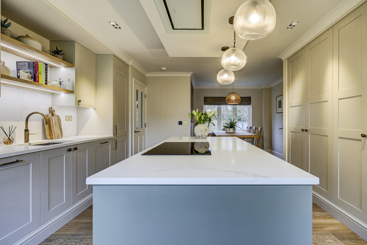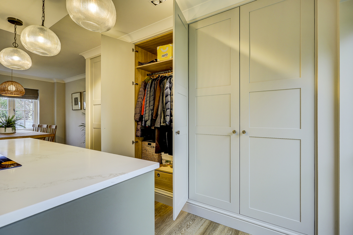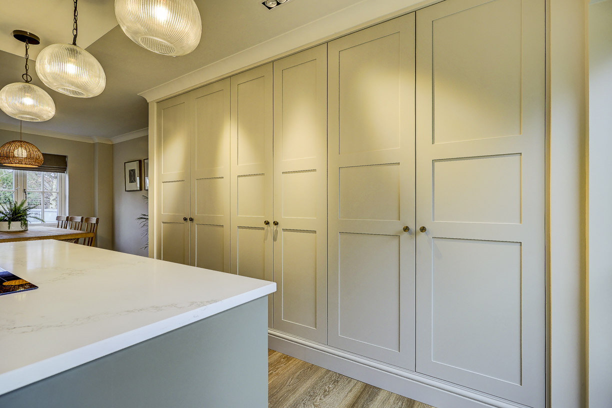 The classic in-frame style cabinetry is finished in soft, neutral tones and paired with a light quartz worktop to keep the space feeling bright and calm. Floor-to-ceiling cabinetry along one wall provides plenty of hidden storage, while integrated appliances keep the design clean and uncluttered.