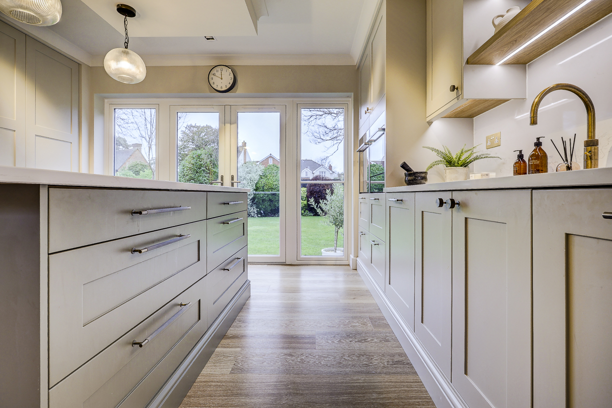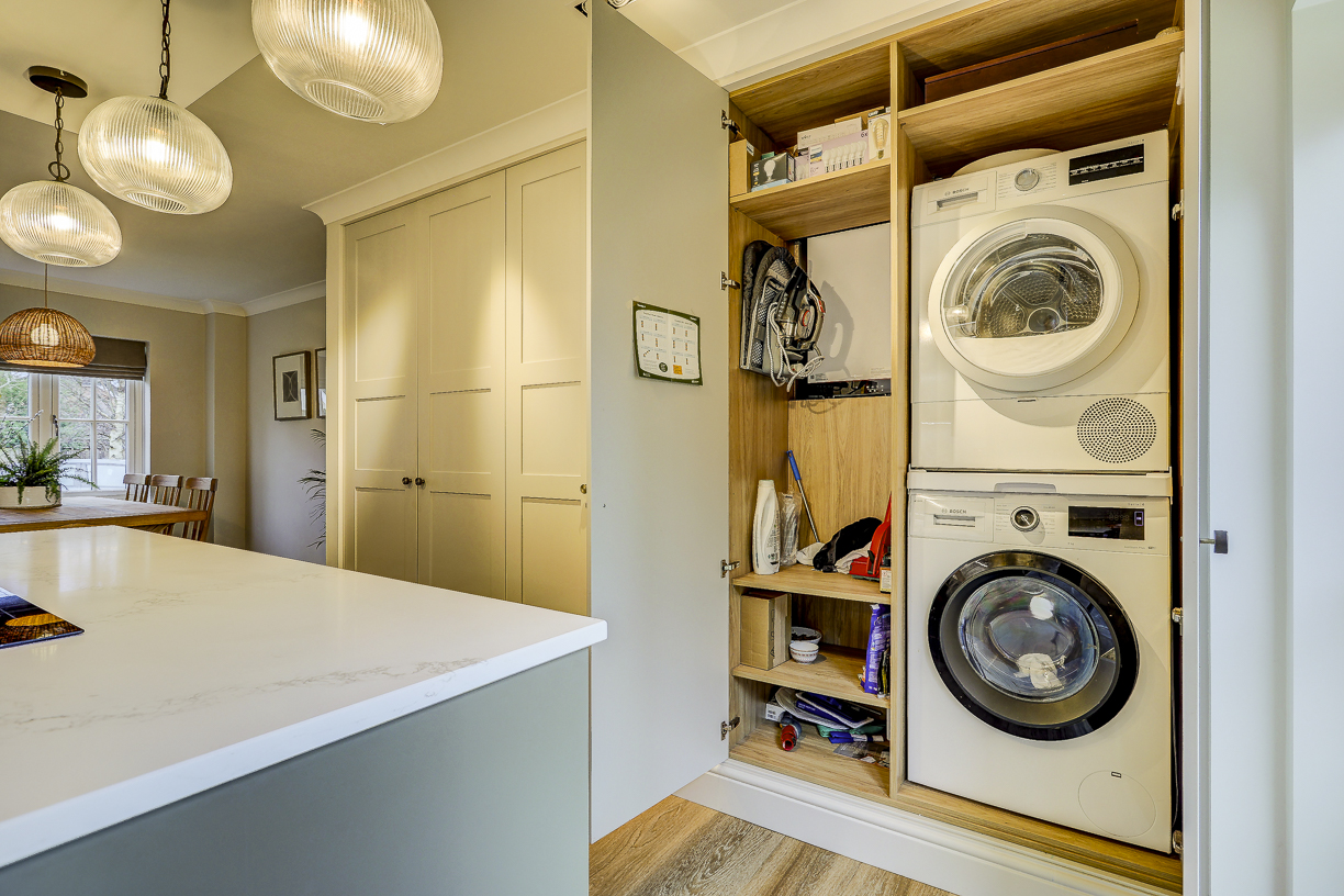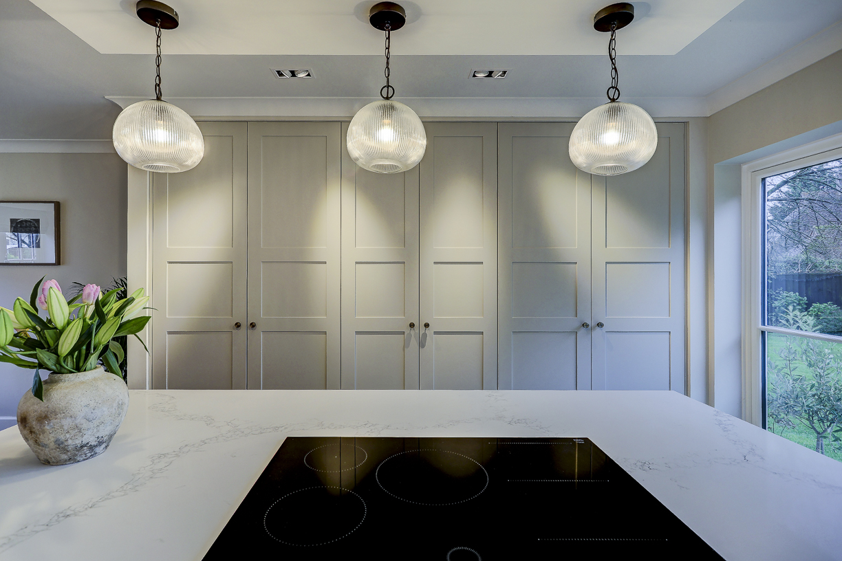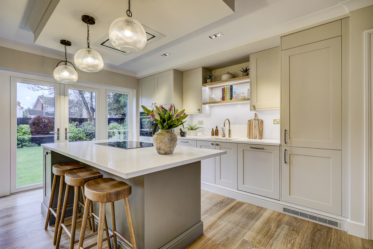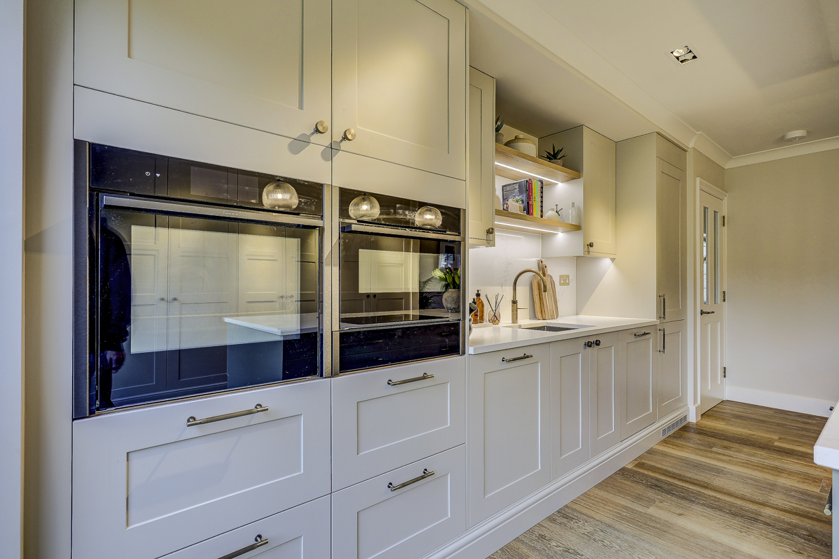 The classic in-frame style cabinetry is finished in soft, neutral tones and paired with a light quartz worktop to keep the space feeling bright and calm. Floor-to-ceiling cabinetry along one wall provides plenty of hidden storage, while integrated appliances keep the design clean and uncluttered.