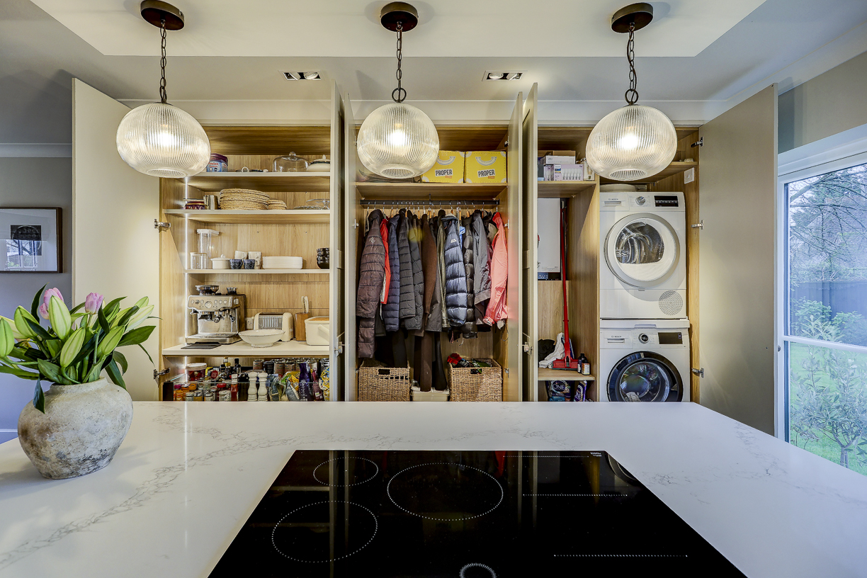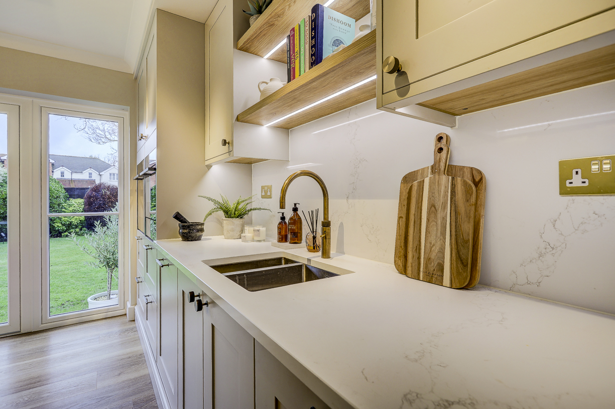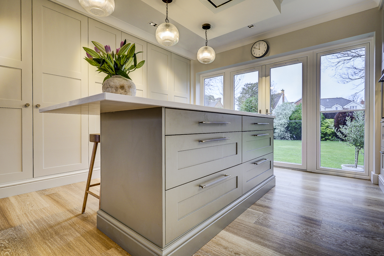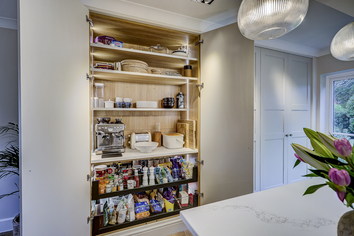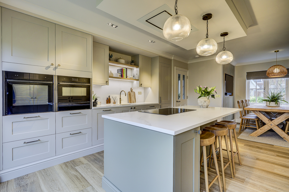 The classic in-frame style cabinetry is finished in soft, neutral tones and paired with a light quartz worktop to keep the space feeling bright and calm. Floor-to-ceiling cabinetry along one wall provides plenty of hidden storage, while integrated appliances keep the design clean and uncluttered.